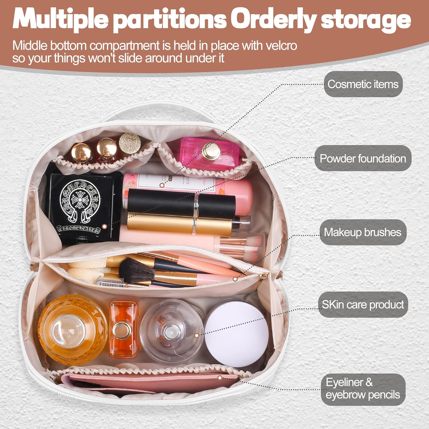• ✅【Friendly Design】Large capacity travel cosmetic bag adopts a double-layer design, which divide the cosmetic bags into left and right two parts,inner pocket with velcro fastening to the bottom,Won't make your stuff move and be neater;Cosmetic bags for women is double zipper large opening design, easier to open and close; comfortable carrying handle at the top of the makeup travel bag, easy to carry and move.