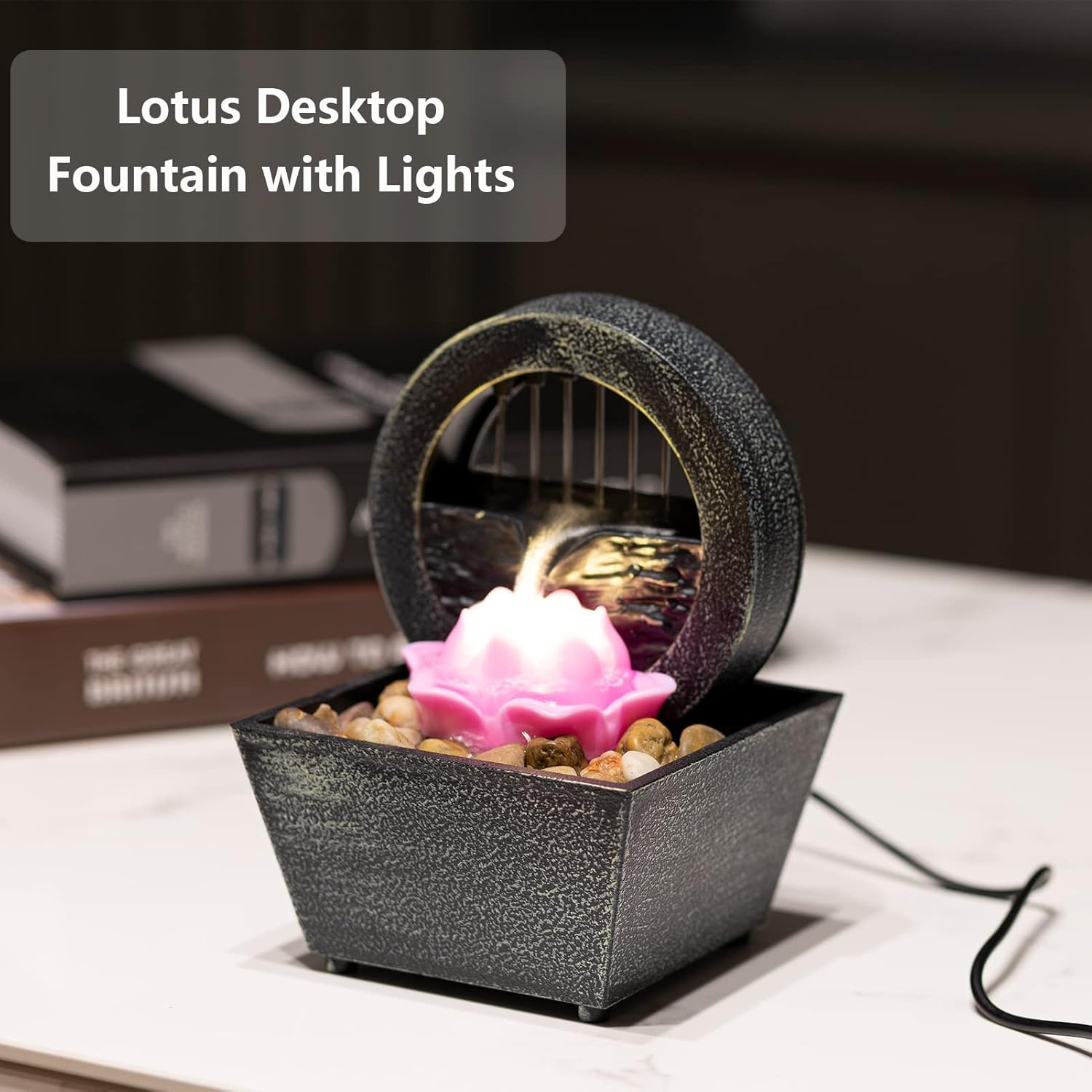 Small Indoor Tabletop Fountain, Zen Meditation Waterfall with Lotus Decor & Natural River Rocks, Cordless Battery Operated Calming Relaxation Desktop Fountain, Great Gift as Home & Office Ornaments