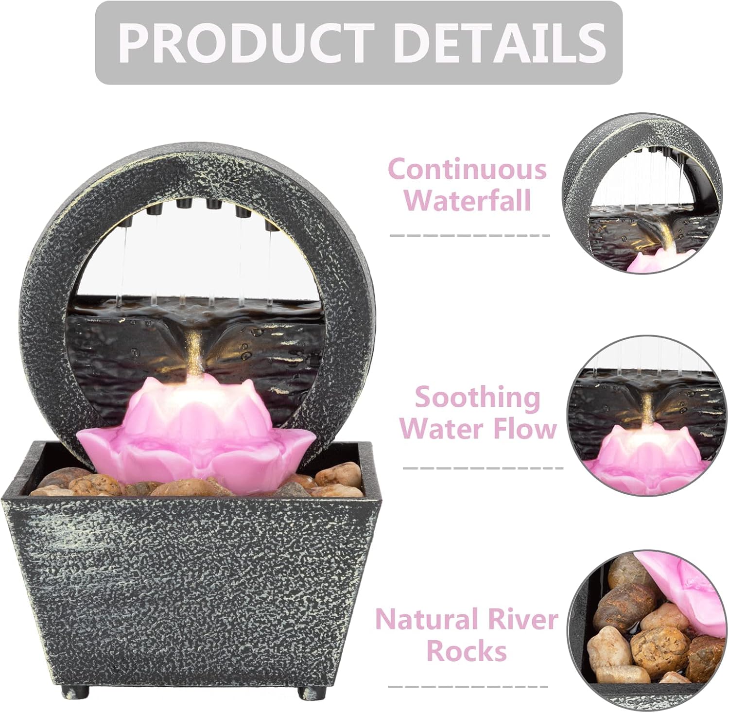 Soothing & Refreshing Indoor Waterfall: The sound of a crashing waterfall combined with the gentle flow brings a sense of nature to your space. A calm and soothing ambiance is created while favoring healthier air humidity in the surroundings.