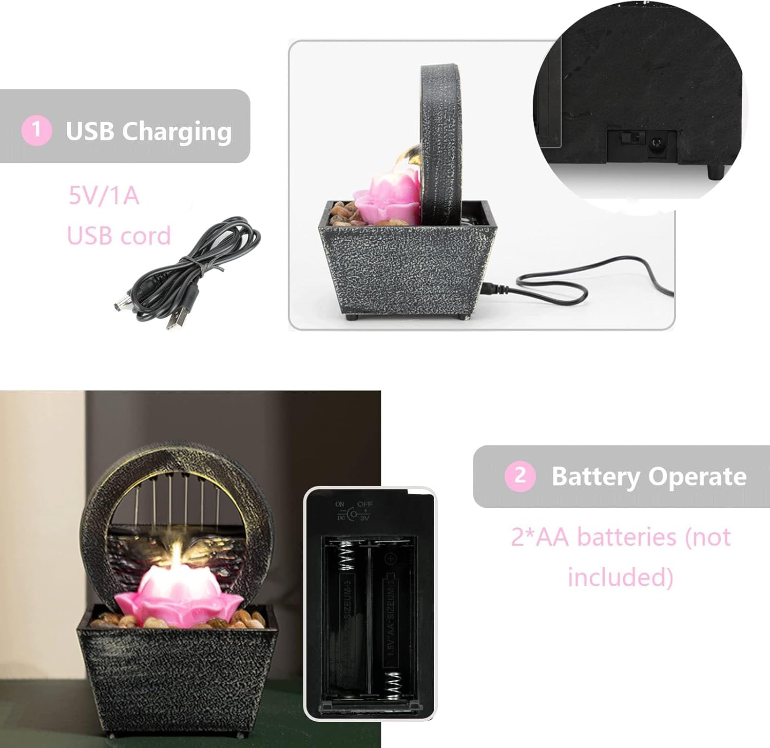 Easy to Assemble & Use: Dual power battery operation - 2*AA batteries (not included) or 5V/1A USB charging. No plumbing is required, just add water, and turn on the power to enjoy both visual and auditory relaxation.