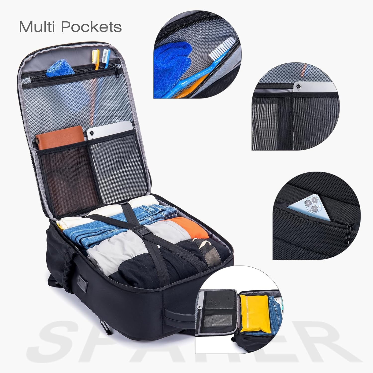 - Expandable Travel Laptop Backpack: with the width expanded from 15cm to 20cm, SPAHER cabin bag can be expanded by 5cm to 40x30x20 cm/24L. It features 2 front zipper pockets, 1 main compartment which concludes 2 open pocket, 2 pens slots and 1 laptop compartments fit up to 17 inch laptop, 1 hidden zip pocket on the back, enough space for your travel accessories.
