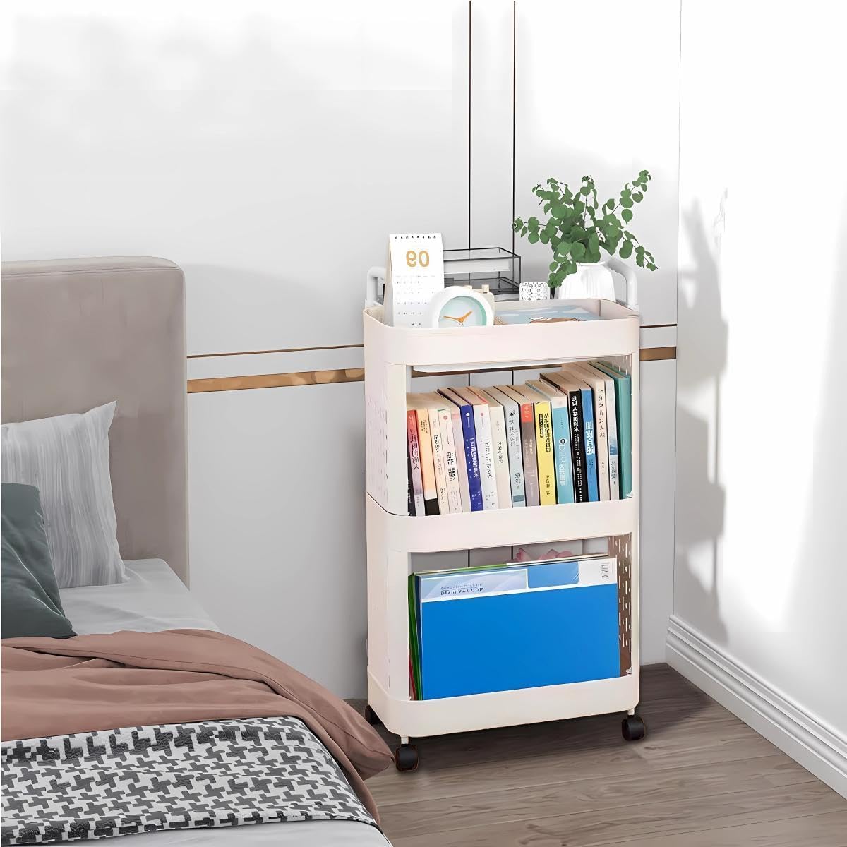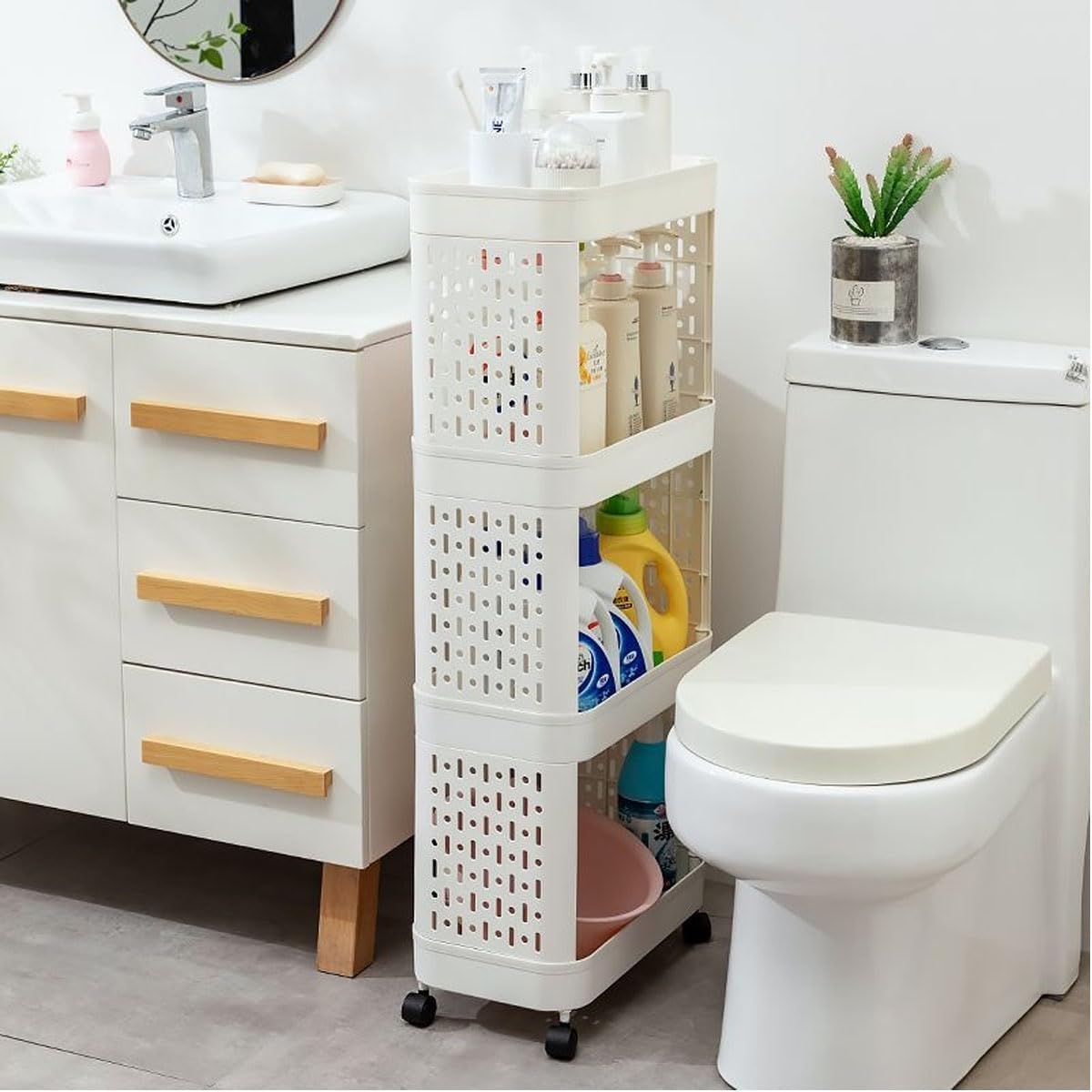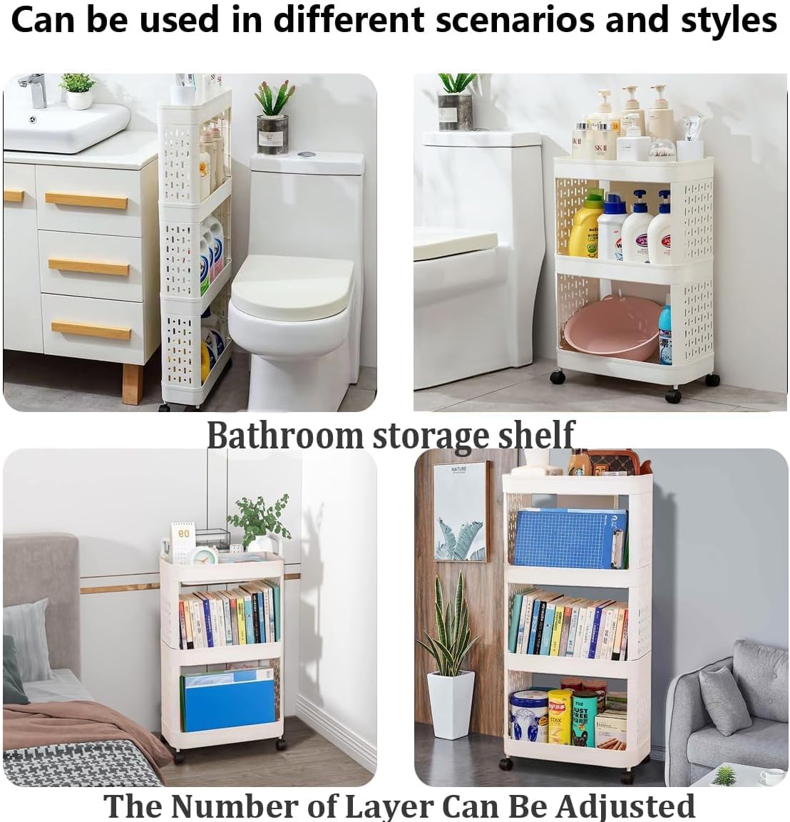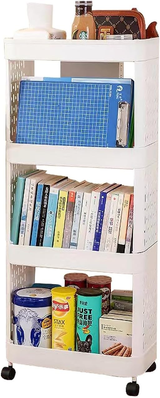 Storage Shelf bathroom storage shelves Plastic Bookcase Organizer Rolling Utility Cart Storage Trolley Rack Easy Assembly for Bathroom Living room Office (White) (4 Tier)