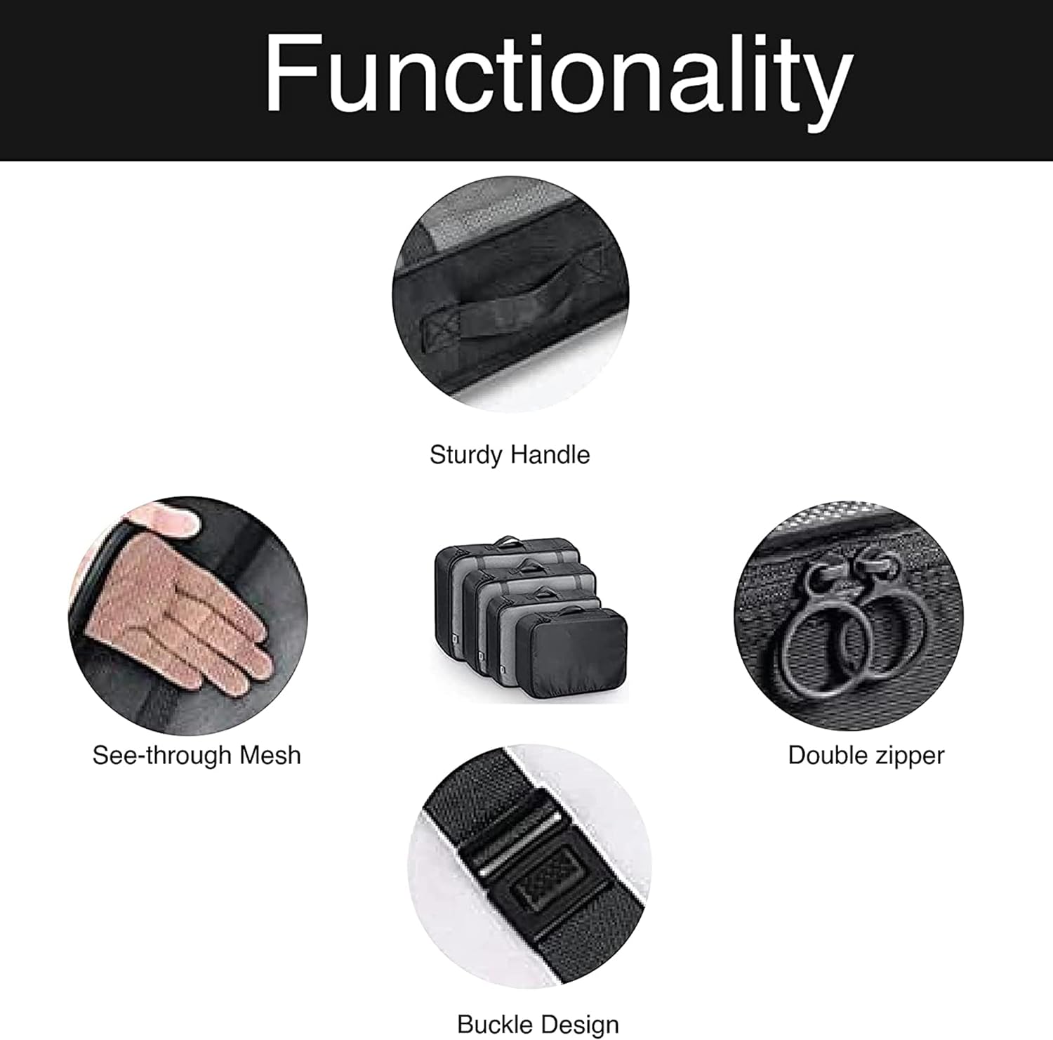Top visible mesh design, transparent & breathable, can save time to find clothes, with fixed buckles in the inner of packing cube to keep your clothes clean and neat. Strong handle design make travel bags easy to carry, or you can fold and put them to your bag, backpack to carry.