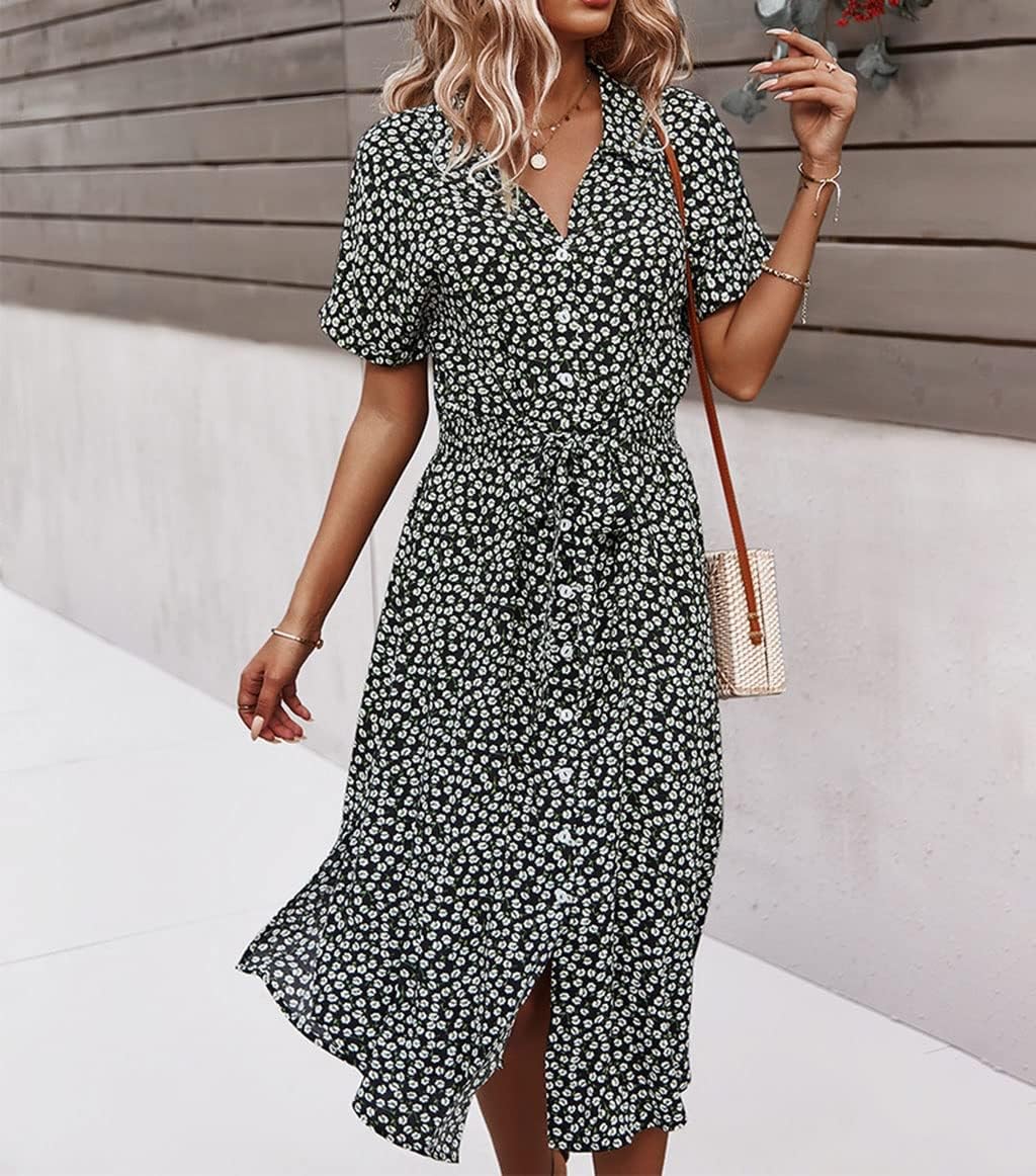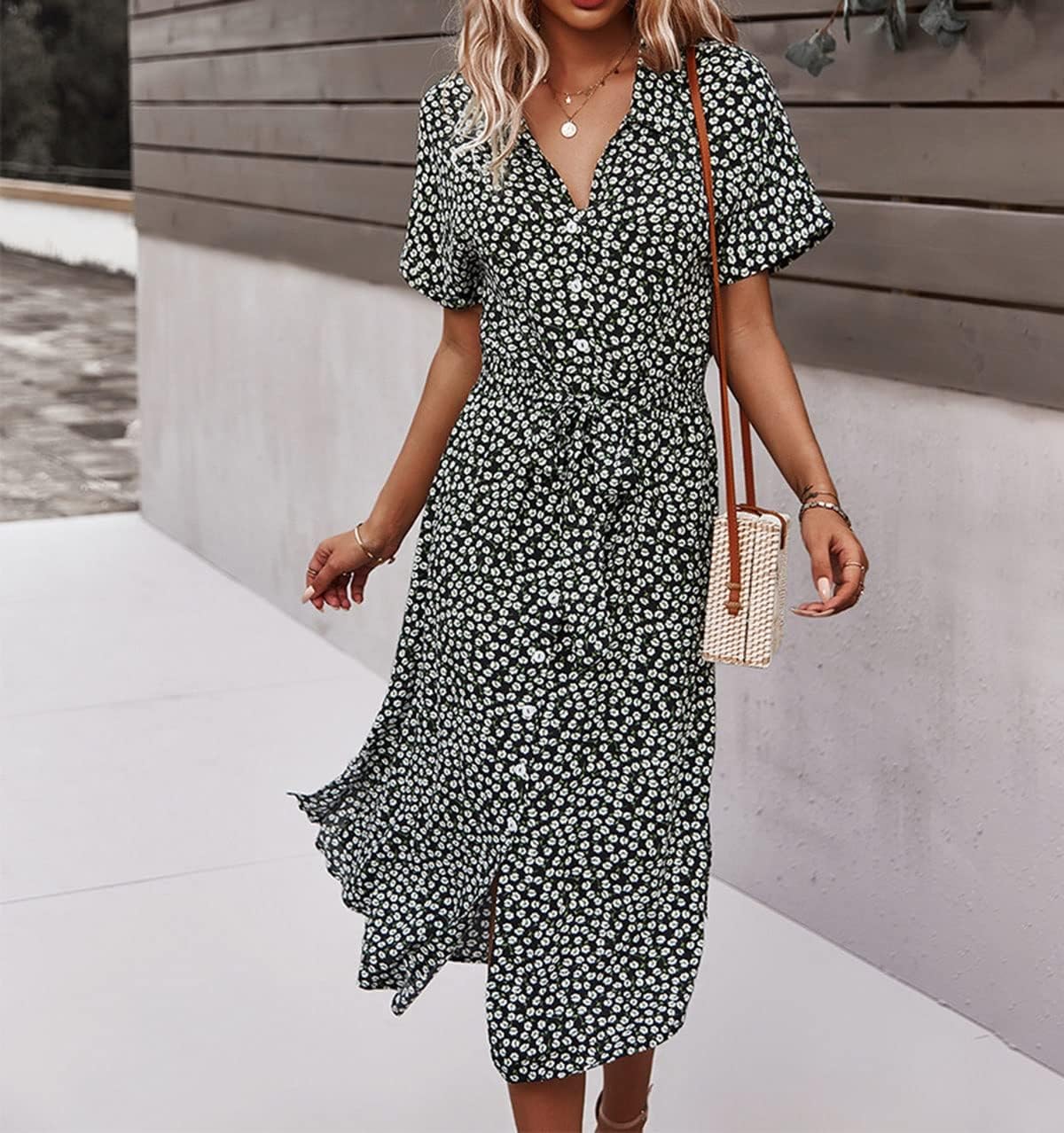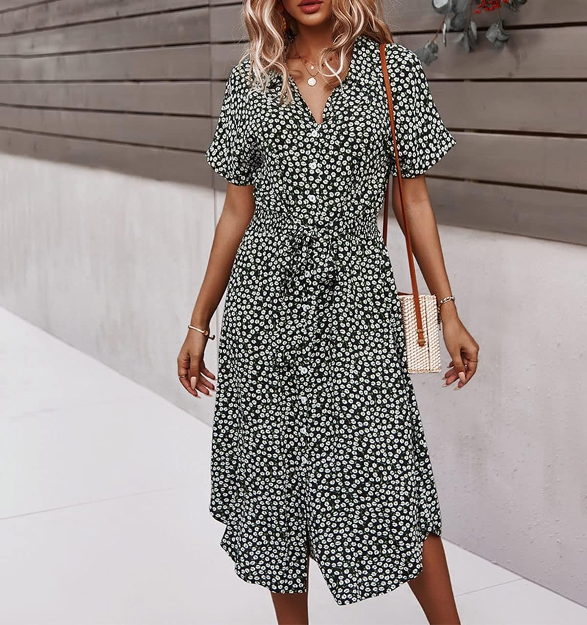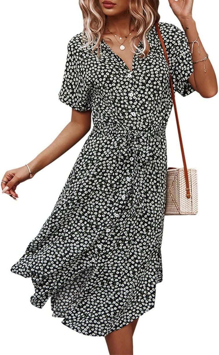 Welcome to our store, no matter the material or the style, wearing them will make you very comfortable and look very beautiful and charming.Fabric: 95% PolyesterClosure: Pull-OnNeckline: V-NeckColor: Pink, Black, Yellow, Blue, GreenGender: Women, Ladies, GirlsLength: Midi Length / Belong/ The Knee / Above The AnkleSeason: Spring, Summer, FallStyle: Bohemian / Boho / Casual / Fashion / Cute Daily / Beach / VacationOccasion: The midi dress is suitable for Fall, Spring, Summer, Date, Party, Work, Beach, Vacation, At Home, and Weddings GuestPackage includes: 1 x Women's DressLaundry Guide:washed Better or Machine To Wash Cold Gentle (recommend With A Laundry Bag ), with Like Colors. Not Shrink. Non-chlorine bleach, hang, Or Line Dry, Iron Low. Can Not Be Dried At High Temperature And High-Temperature Ironing.Note:1. Please allow there is a 2-3cm difference according to manual measurement. make sure you don't mind before ordering.2. The color of the product in the picture may be slightly different from the color of the actual product.Reminder: We only sell dresses, others are just for display. If you have any problem with your order, please feel free to contact us. We will easily replace or refund your purchase!