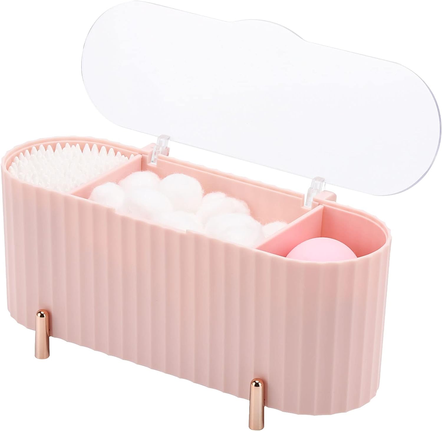 Tecbeauty Qtips Holder, 3 Grids Separate Cotton Swabs Dispenser, Cotton Ball Storage Box, Jar for Cotton Pads Bathroom Organizer Canisters - Pink