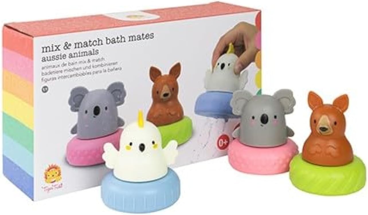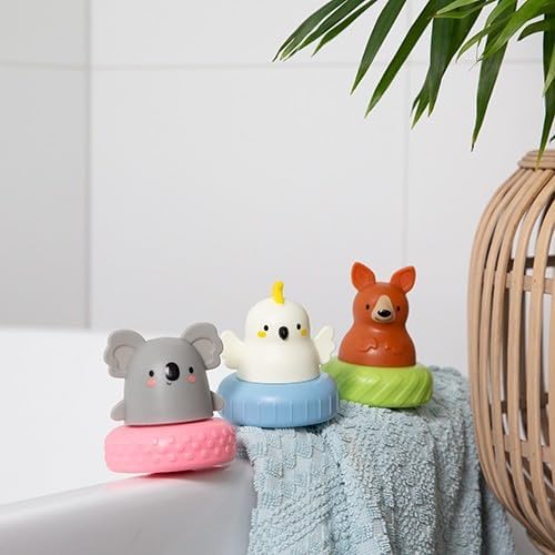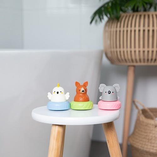 Tiger Tribe Aussie Animals Mix and Match Bath Mates turns water play into a time of endless fun and discovery. The three cute Aussie animals on a bath time tyre float. Kids will enjoy watching koala, kangaroo and cockatoo as they bob up and down in the suds. Swap the coloured tyres for a bit of mix and match fun and clued in kids will spot an array of different patterned draining holes in the bottom of each tyre. Fill the animals up with bath water, pop the tyres back on and then squeeze to watch the water spurt out in different patterns.