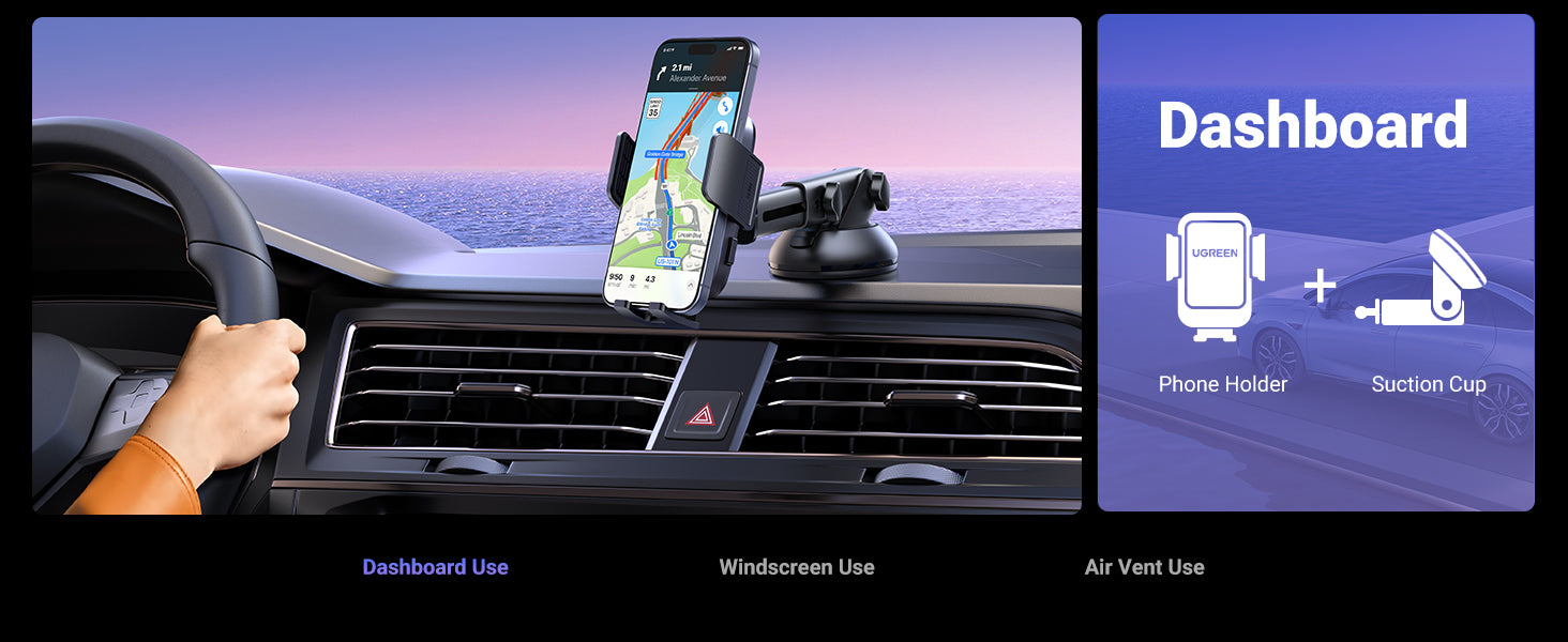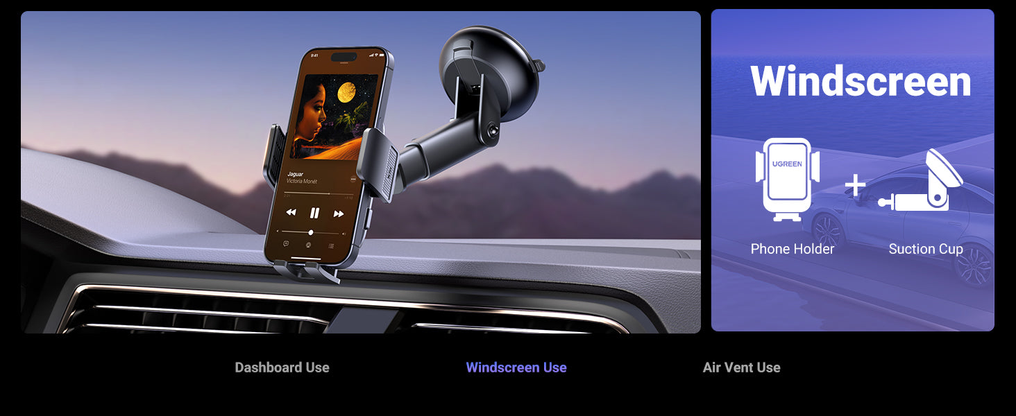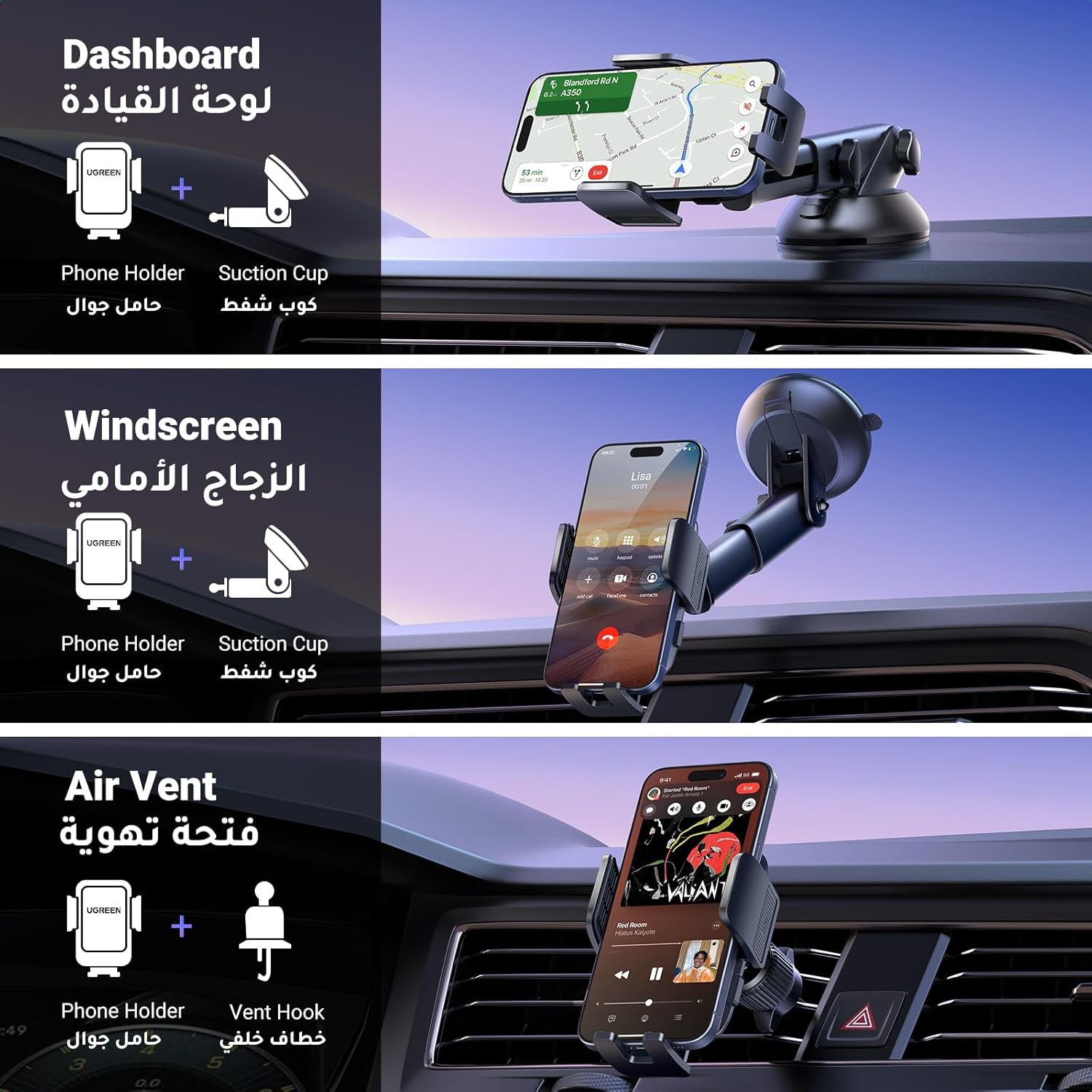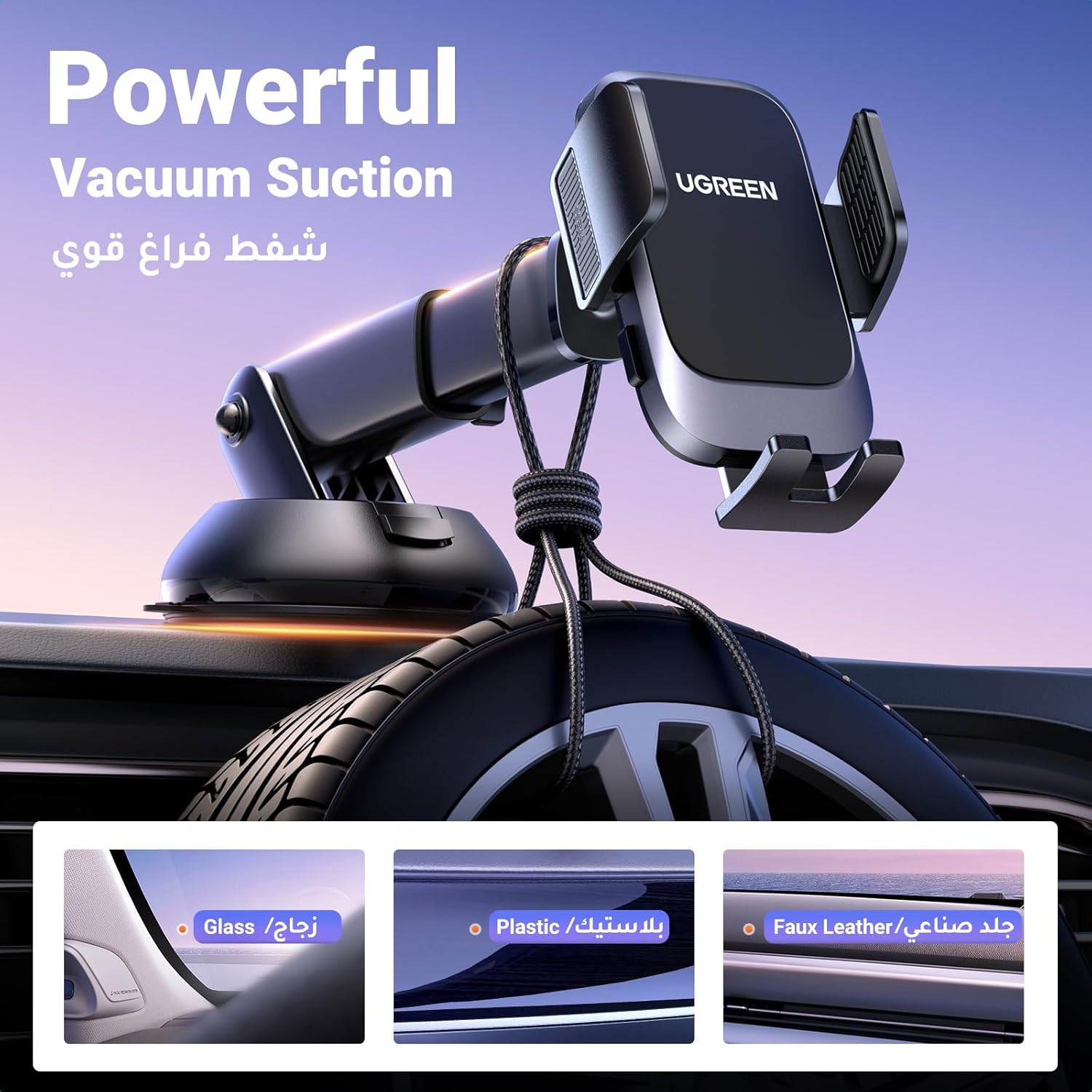 【2024 3rd-Gen Secure and Reliable Suction Cup】Adopted upgraded Nano layers and a double-locked enlarged suction cup, this car phone mount can provide strong suction power and be fixed on a smooth surface and keep stable in any condition. With heat-resistant gel, UGREEN mobile holder for car can also help you solve the old problem that the general suction cup phone holder falls off in the hot weather in the UAE summer.