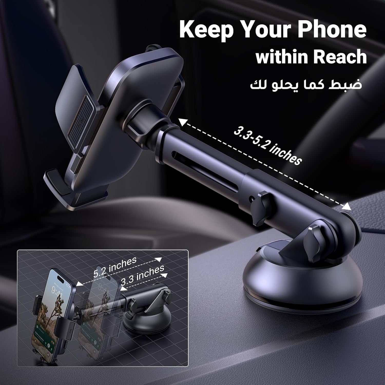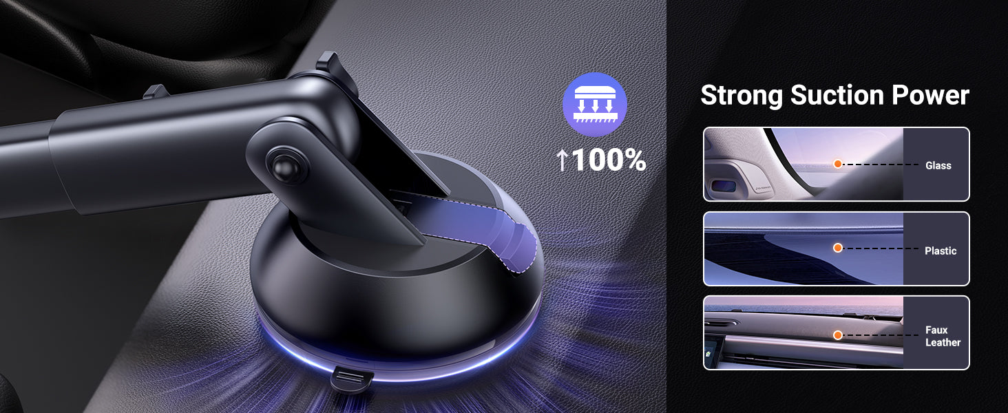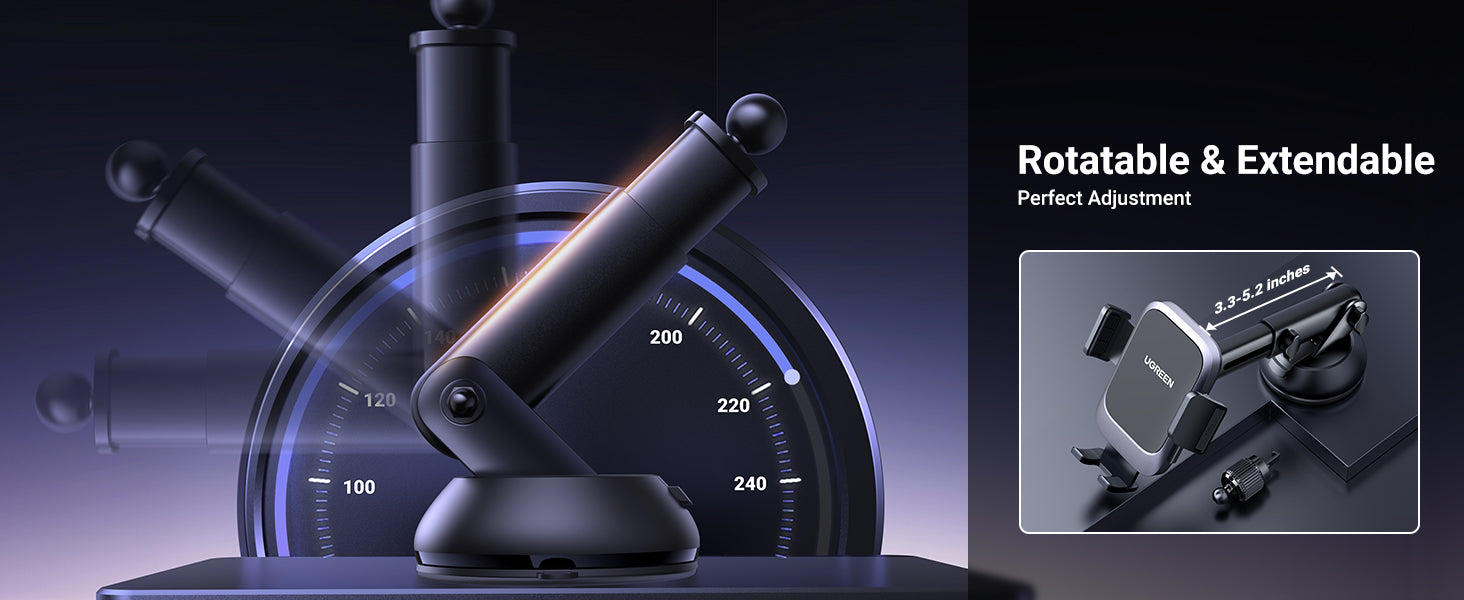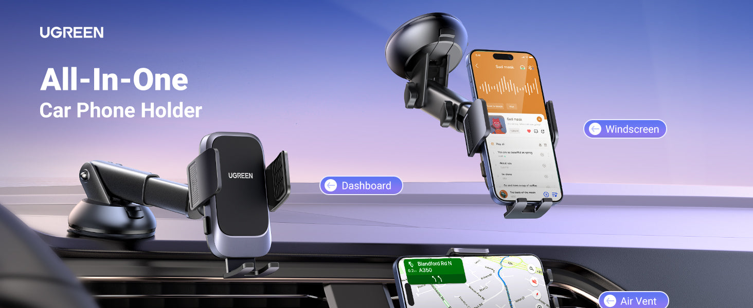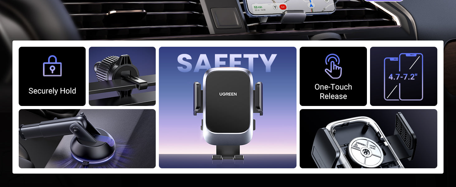 【2024 3rd-Gen Secure and Reliable Suction Cup】Adopted upgraded Nano layers and a double-locked enlarged suction cup, this car phone mount can provide strong suction power and be fixed on a smooth surface and keep stable in any condition. With heat-resistant gel, UGREEN mobile holder for car can also help you solve the old problem that the general suction cup phone holder falls off in the hot weather in the UAE summer.