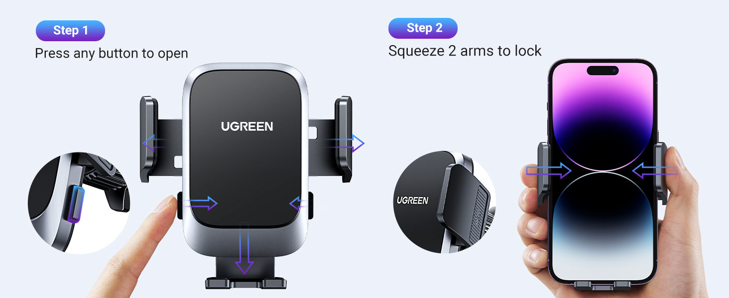 【Easy Operation: One Button Release】Easy clamp, easy go. Just simply press the side button and the left and right clamp arms would open automatically. Then you can easily place your phone in or take it out. After placing the phone, just gently clamp the arms towards the middle, it will lock and hold your phone firmly.