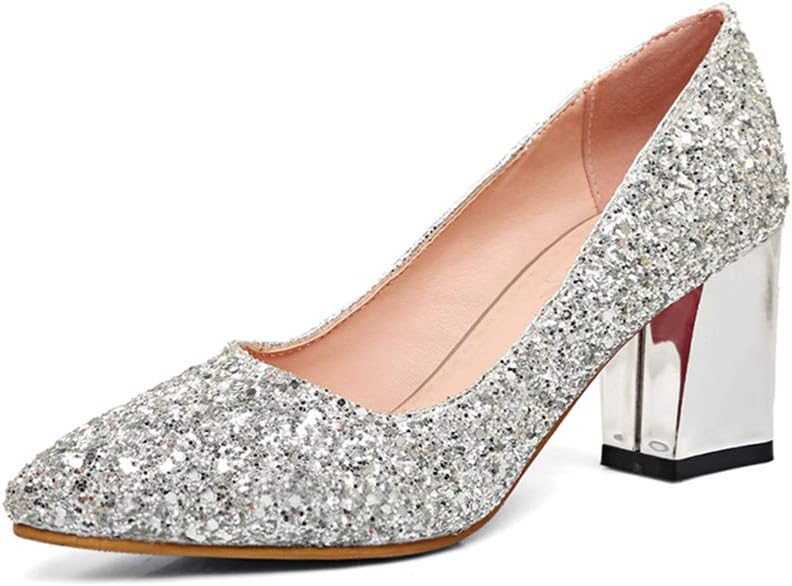 Women's Sparkling Glitter Chunky Heel Closed Toe Pumps Comfortable Mid – BUYO