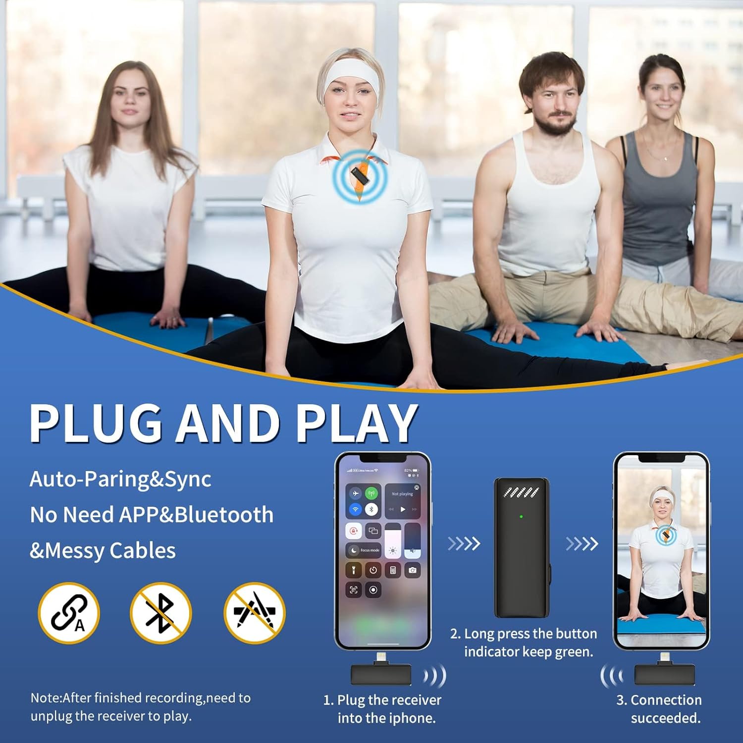 【Plug & Play Microphones】XVersion Wireless Microphone includes 1 transmitter and 1 receiver for audio recording. Plug & Play Microphones, you don't need any APP or bluetooth, just plug the receiver to your recording device, and switch on the microphone, then it pairs automatically.